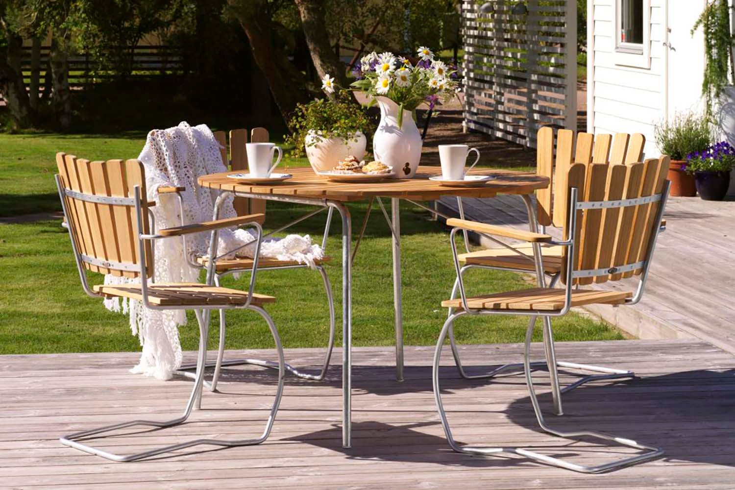 En klassisk stol som sätter begreppet tidlös design på kartan. 1956 tillverkades den allra första stolen och med sin tilltalande design där ribbor av teak snyggt bryter av mot den varmgalvaniserade stålstommen är den lika aktuell nu som då. Bordet är hopfällbart och stolarna praktiskt stapelbara.