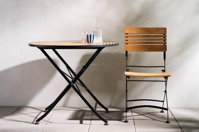 En klassisk bistroserie med tidlös cafécharm. Tillverkad i slitstarkt, svart pulverlackerat stål med släta ribbor i teak. Brewer är fällbar, tar liten plats och passar lika bra på balkongen som på uteplatsen.