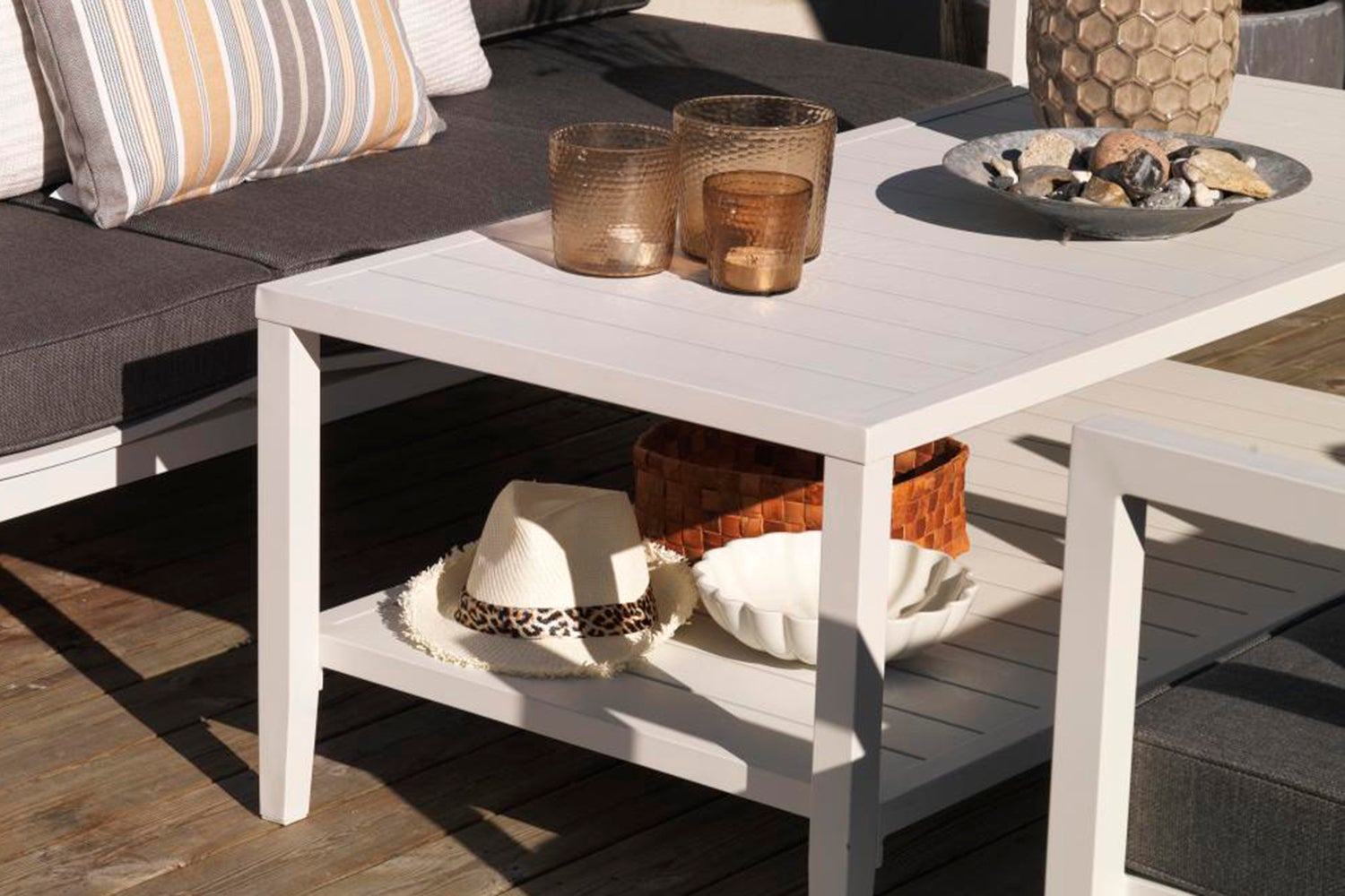 Soffbord i mattlackerad aluminium i olika storlekar med praktisk tidningshylla.
