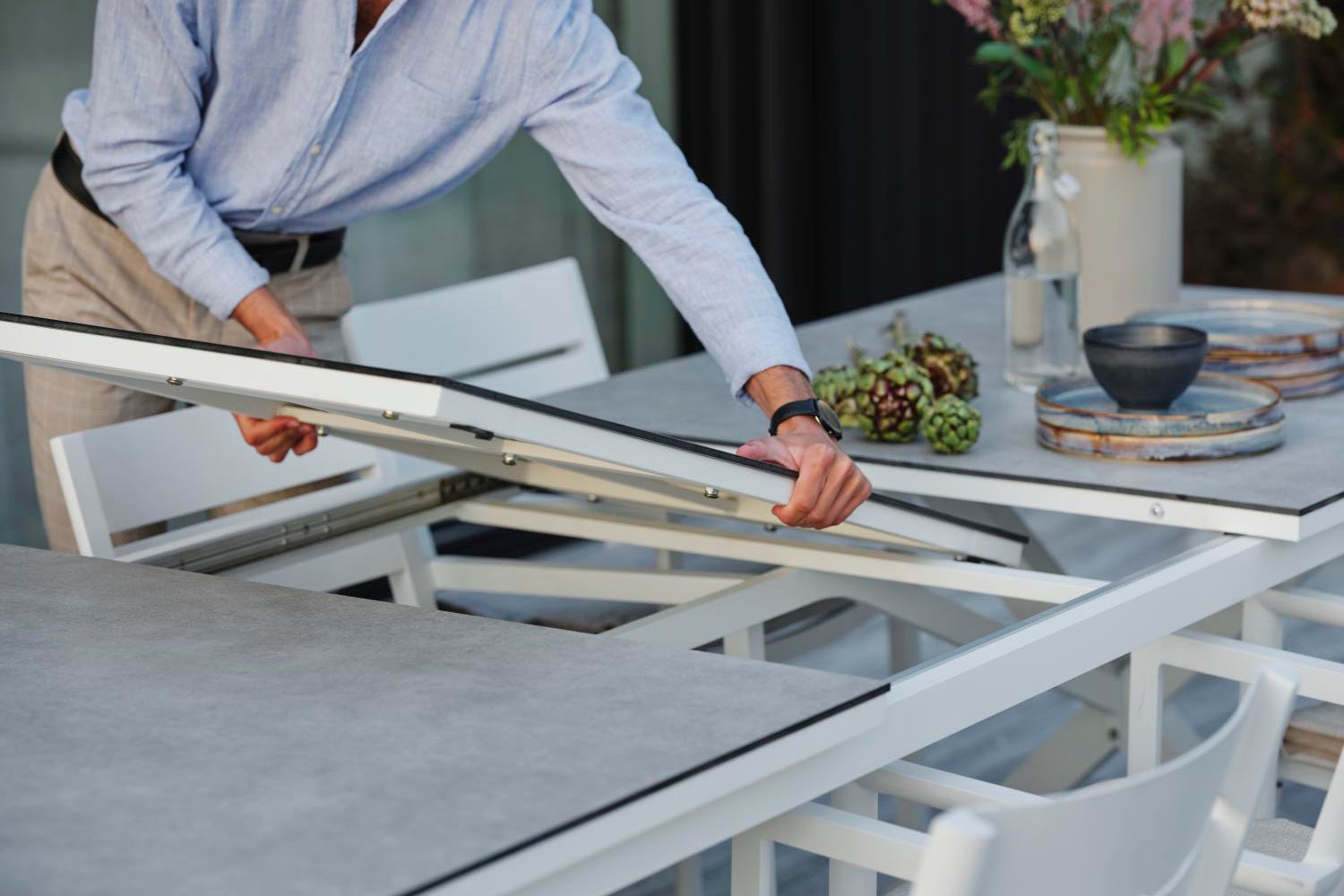 Dags att samla vänner och familj till en riktigt härlig fest? Då är utdragsbordet Hillmond det perfekta valet. Antingen väljer du vårt längsta utdragsbord som har plats för minst 12 personer, eller så väljer du den mindre varianten som 8-10 personer kan samlas runt. Bordet har underrede av lackad aluminium och till bordsskivan kan du välja antingen tvärgående aluminiumribbor med präglat trämönster eller någon av våra trämönstrade laminatskivor.