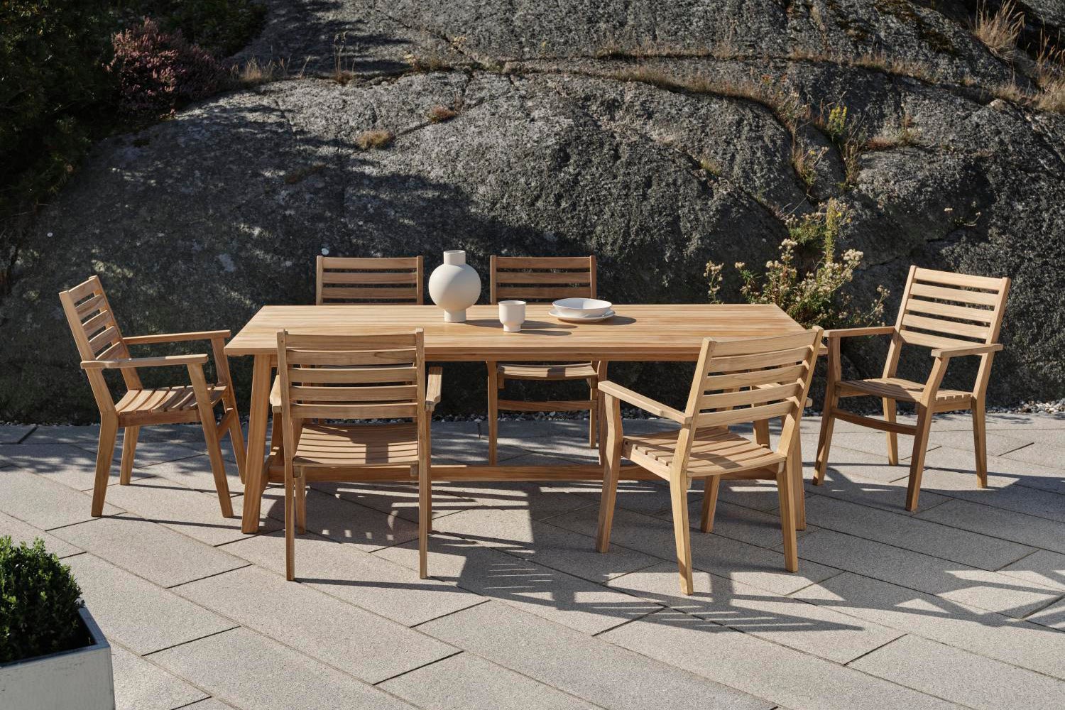Keros; en serie i stilren naturlig teak. I serien finns matbord, bordshylla, karmstol och bänk; samtliga med samma stiliga och mjuka form på brädor.
