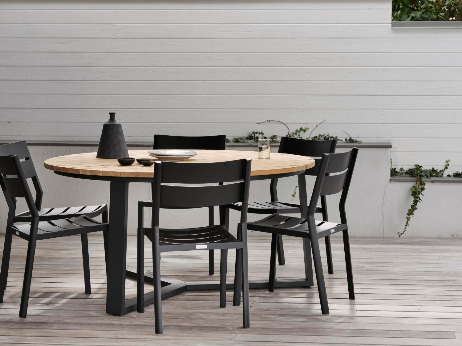 Ett vackert modernt teakbord präglat av en bordstopp i unik design och ett skickligt hantverk. Lättplacerat och generöst.