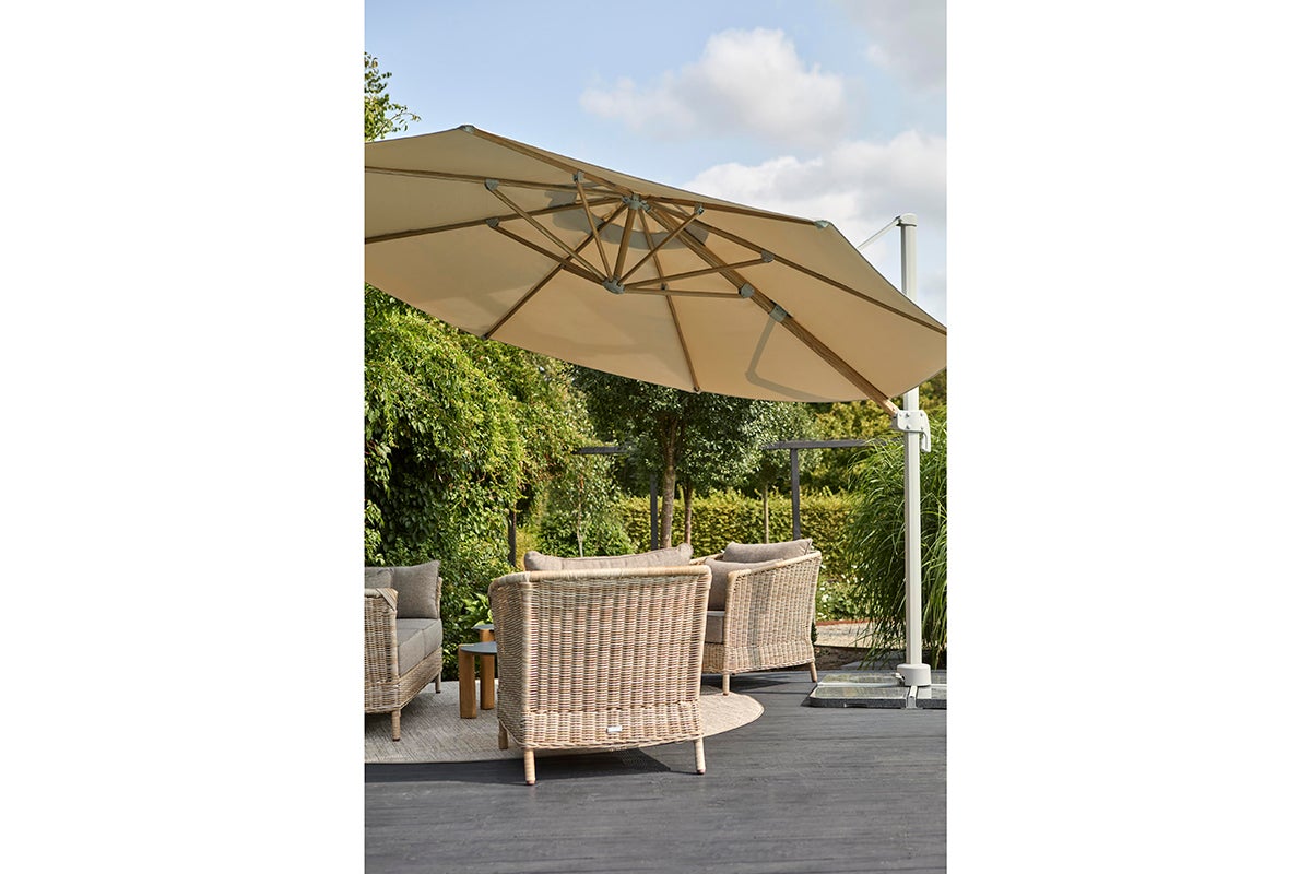 Luzzi parasoll har stomme i sobert ljusgrå. Ribborna är tryckta med ett vackert trämönster, vilket ger en varm om ombonad känsla. Luzzi är ett fristående parasoll med ett 250 g garnfärgat polyestertyg och ett aluminiumstativ med vev och steglös kontroll. Basen är inkluderad men måste förankras med parasollfotsvikter eller liknande.
