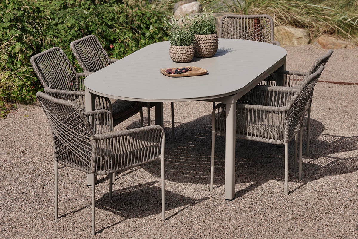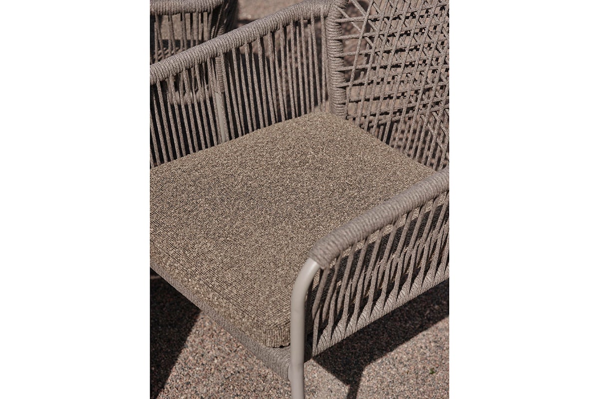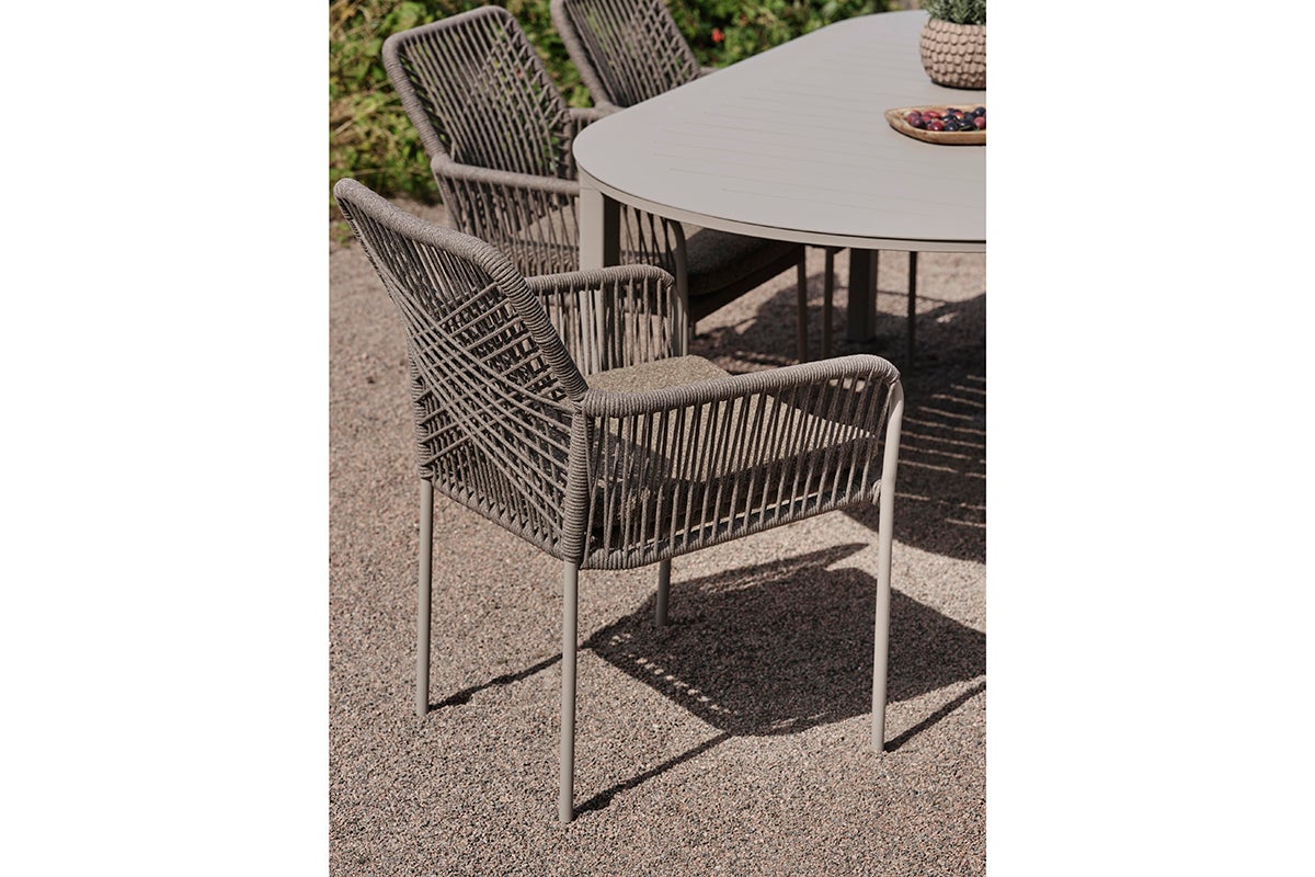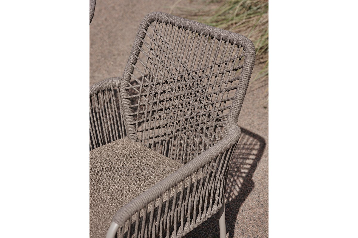 Denna bekväma matstol har en flätad repdesign som står emot väder och vind. Stålramen ger ett stabilt stöd samtidigt som den motstår rost och korrosion, vilket säkerställer långvarig användning i alla klimat. Det vackert flätade mönstret på sits och rygg ger en organisk känsla som förstärks av sina jordnära toner, och inbjuder dig att slappna av. Sittdyna ingår för extra komfort.