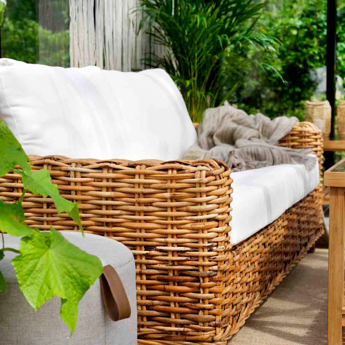 Att äkta rotting är vackert kan vi enas om. Och vår Rossvik är en pampig loungegrupp med soffa och fåtölj med inbjudande proportioner.